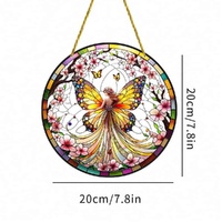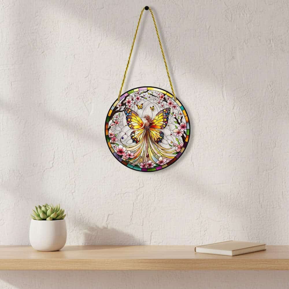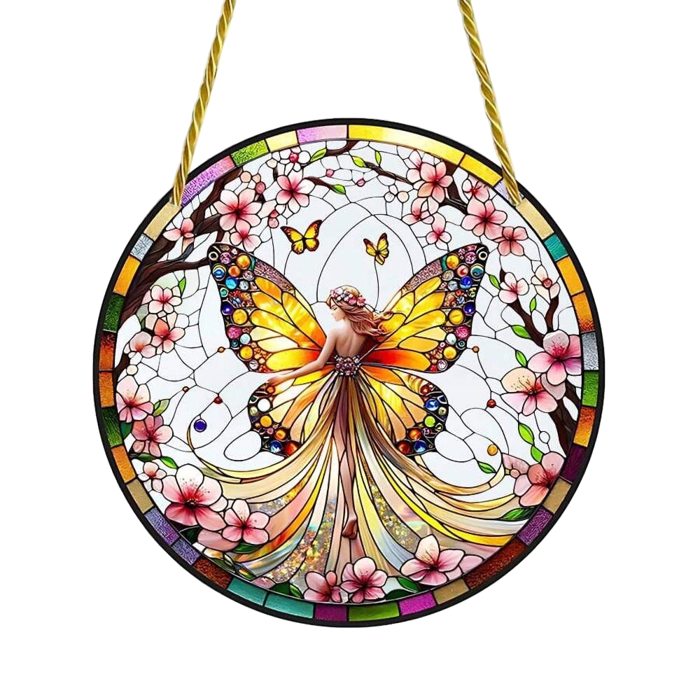 Fill your home with radiant colour using our Golden Butterfly Fairy Suncatcher Disc (Large). This beautiful acrylic piece features a graceful fairy with glowing butterfly wings, surrounded by blossoms, butterflies and a stunning stained-glass inspired border. In sunlight, the disc glows with warm golden hues and vibrant springtime energy.