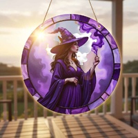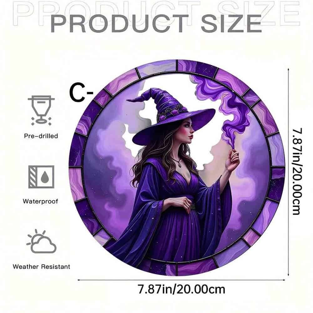 Enchant your space with our Mystic Violet Witch Suncatcher Disc (Large). This striking acrylic piece features a powerful witch cloaked in deep violet hues, framed by swirling magical smoke and stained-glass inspired details. The vibrant artwork comes to life in sunlight, casting a mystical glow wherever it hangs.