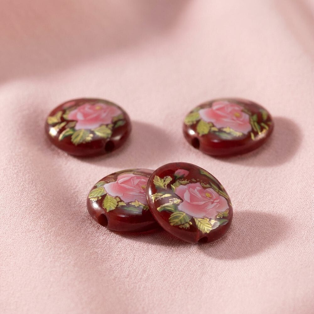 Add a romantic, vintage-inspired touch to your designs with these Burgundy Rose Garden Puffed Coin Glass Beads. Each 14mm bead features a beautiful rose motif with rich pink petals and soft green foliage, displayed on a smooth, domed coin-shaped bead. Perfect as focal pieces for bracelets, earrings and necklaces.