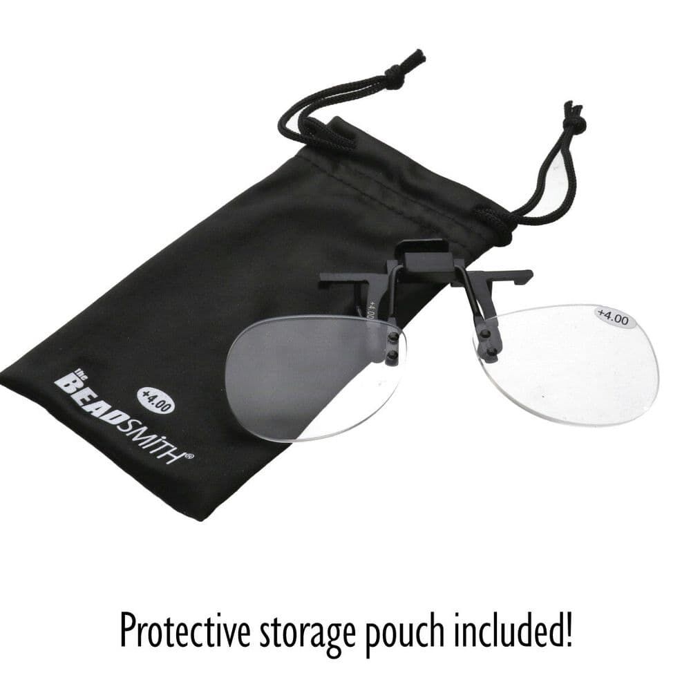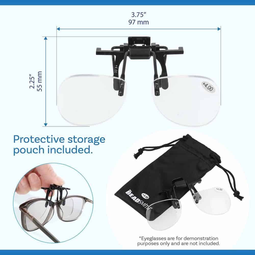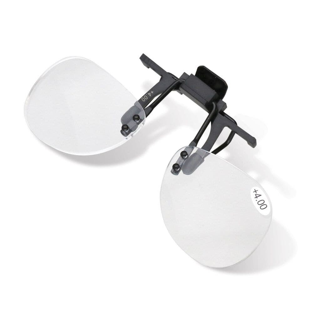 Clip-On Magnifier for Glasses +4.0 provides powerful, hands-free magnification for reading, beading, sewing and jewellery making. The +4.0 lenses deliver clear, close-up detail while attaching easily to most eyeglass frames.