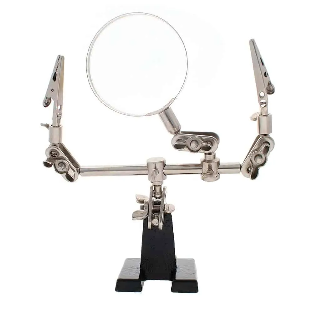 The Double Third Hand Work Holder with Magnifier is an essential tool for jewellers, hobbyists, and crafters who need precision and stability. Featuring two fully adjustable alligator clips mounted on a sturdy base, this tool holds your work securely in place while you solder, glue, or assemble.