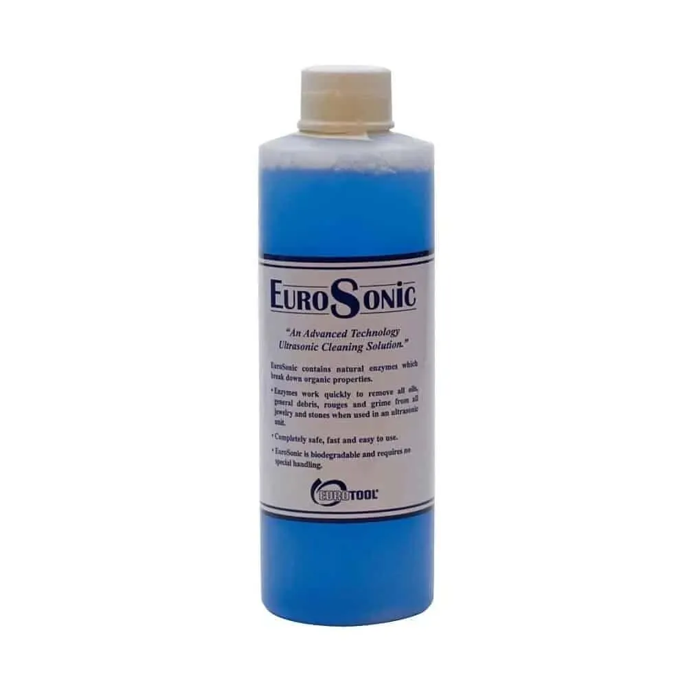 EuroSonic concentrate is an advanced technology bio-friendly ultrasonic cleaning solution containing thousands of enzymes which will remove body oils, debris, rouges and grime accumulations from metals, stones and other materials.
