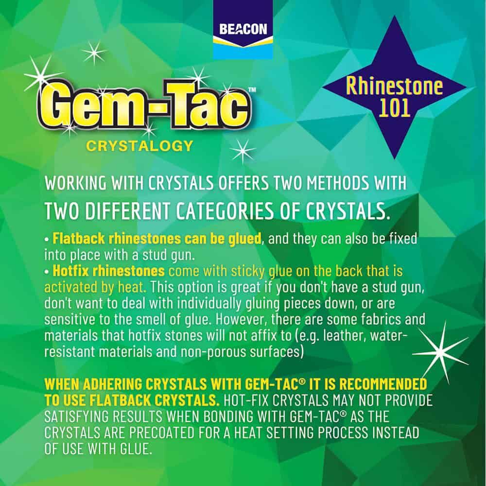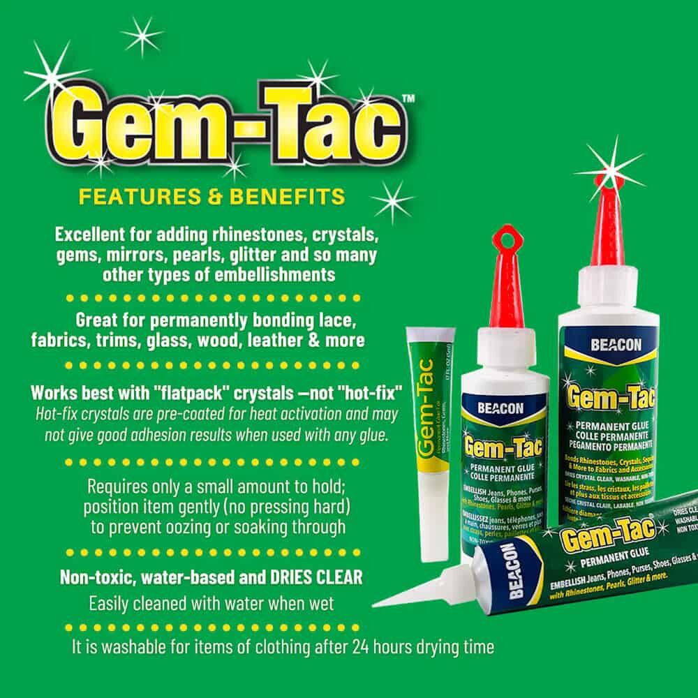 Gem-Tac glue is a popular rhinestone and fabric adhesive used for attaching rhinestones, pearls, beads, sequins and decorative trims to fabric and craft surfaces. It dries clear, remains flexible and creates a strong, permanent bond for embellishing clothing, accessories and home décor projects.  Explore more jewellery glues and adhesives.
