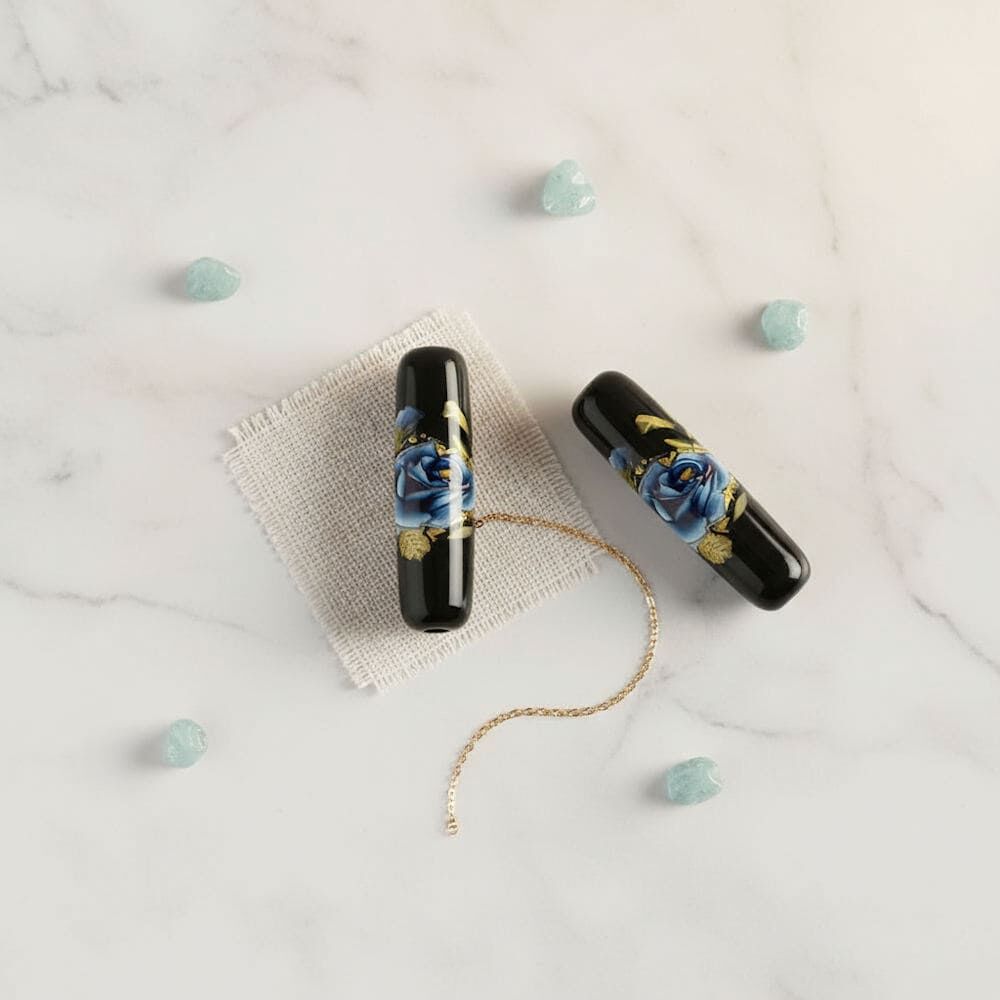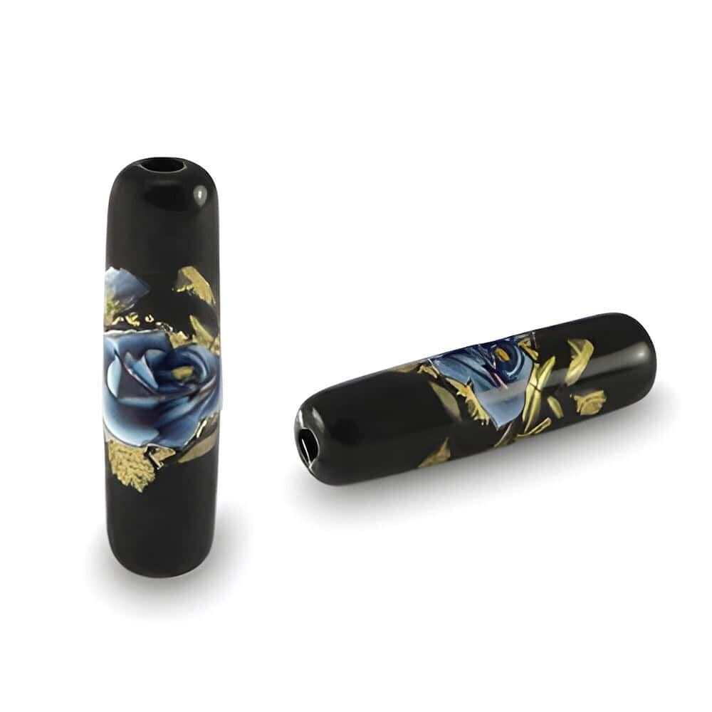 Glass Tube Flower Beads – Midnight Blue Rose bring depth and sophistication to your jewellery designs. These black glass beads feature a rich blue rose motif with gold highlights, creating an elegant and dramatic floral accent.