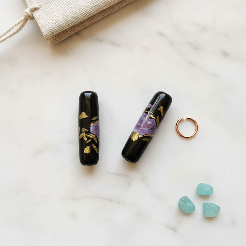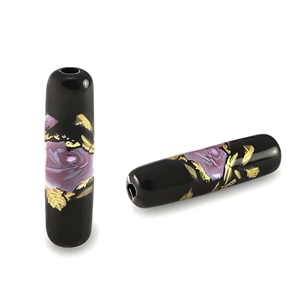 Glass Tube Flower Beads – Midnight Rose Bloom bring dramatic elegance to your jewellery designs. These striking black glass beads feature a soft lilac rose motif with gold highlights, adding contrast and sophistication to any creation.