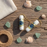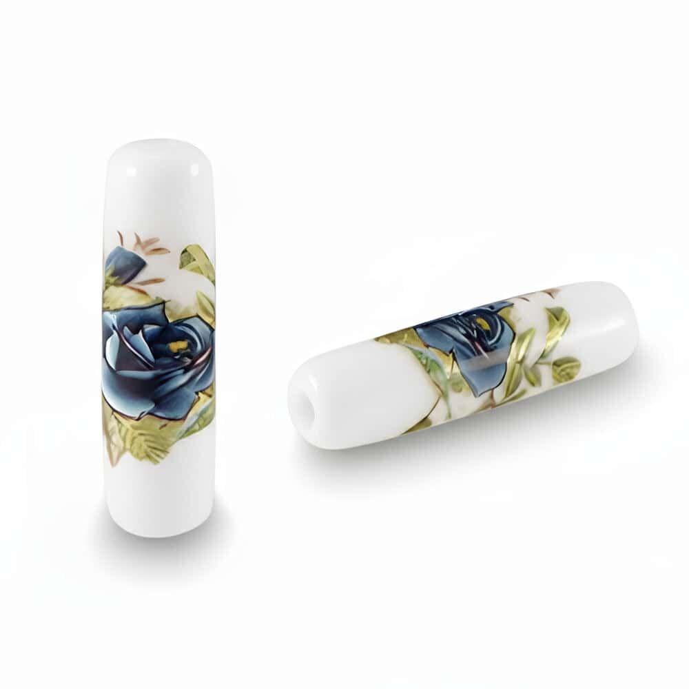Glass Tube Flower Beads – Moonlight Rose add an elegant contrast to your jewellery designs. These white glass beads feature a deep blue rose motif with gold accents, evoking the timeless beauty of moonlit blossoms.