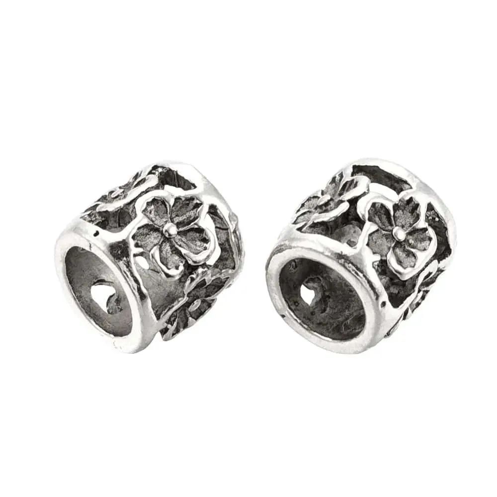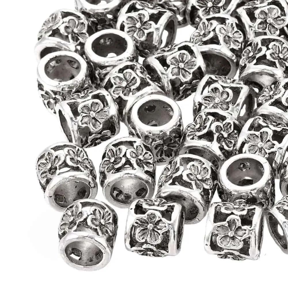 Add vintage-inspired detail to your jewellery designs with these beautiful large hole metal beads in our exclusive Antique Silver Bloom finish. Featuring a raised floral pattern and softly darkened antique silver tone, these column-style beads bring elegant texture and character to bracelets and craft projects.