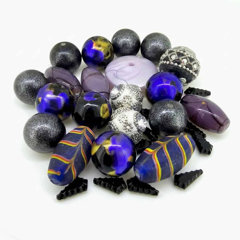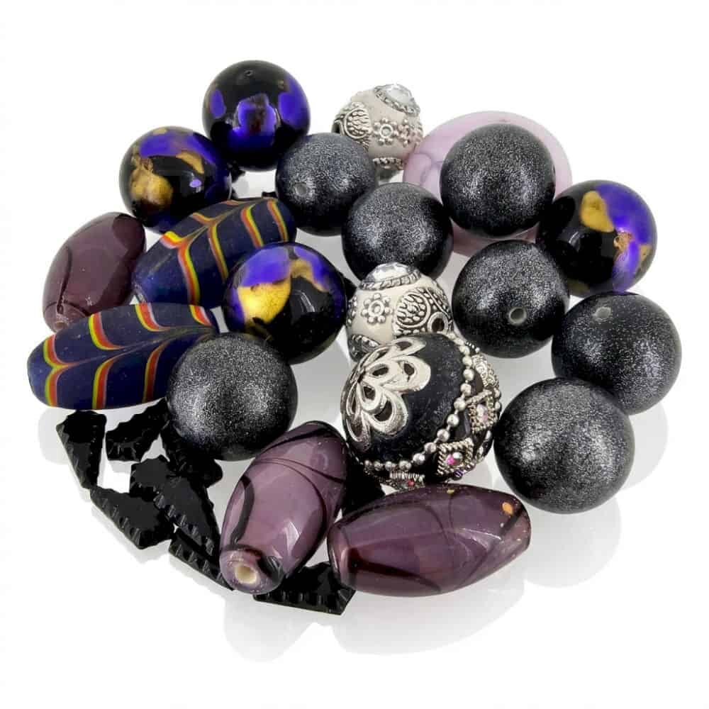 Midnight Treasure Eclectic Bead Mix – a striking assortment of beads in deep black, plum and metallic tones, perfect for bold and dramatic jewellery designs.