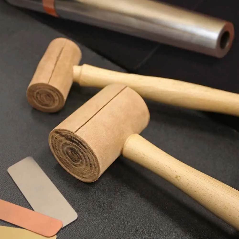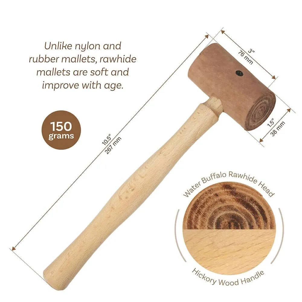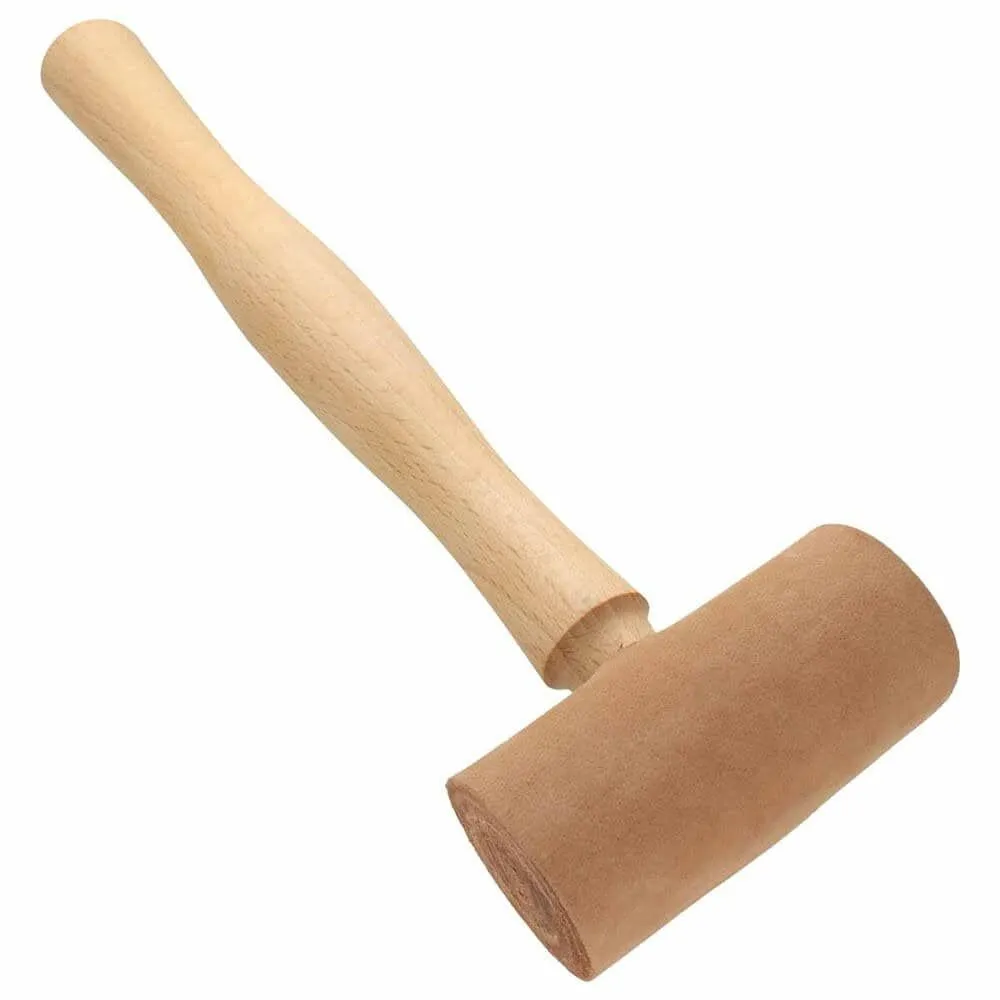 Rawhide mallets are essential tools for leatherworkers, jewellers, and brass wind instrument makers. They are used for tasks like tapping down stitch lines, securing glued layers, and installing hardware such as snaps, rivets, and grommets. Made from tightly coiled leather, these mallets provide a soft, striking surface ideal for working with soft metals and leather without causing damage.