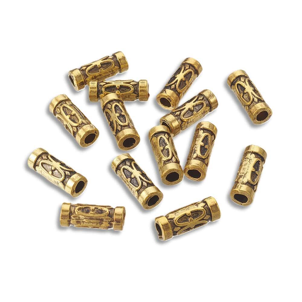 Featuring a Tibetan-inspired pattern and antique golden finish, these slim tube beads are perfect as spacers in bracelets, necklaces and mixed media jewellery designs.