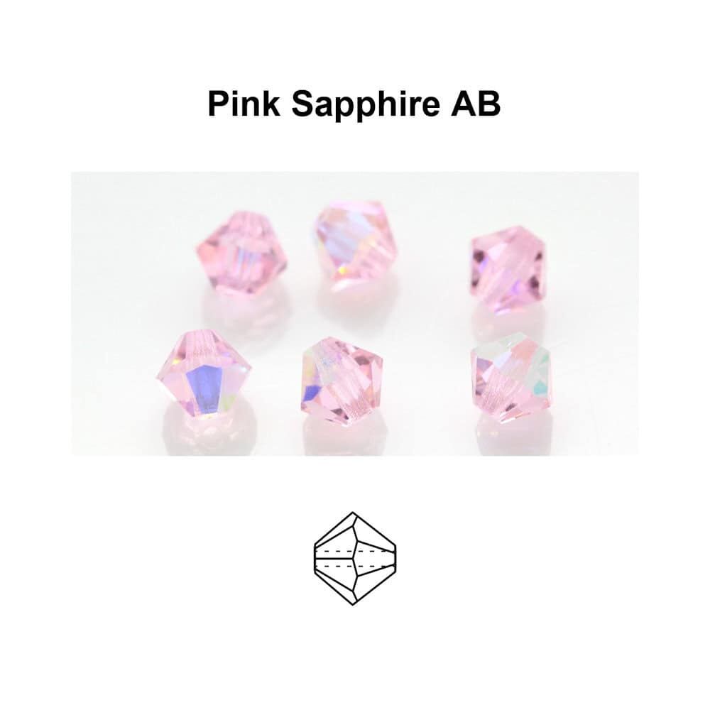 Add soft colour and refined sparkle to your jewellery designs with these elegant Preciosa 4mm crystal bicone beads in Pink Sapphire AB. This delicate blush-pink crystal is enhanced with an Aurora Borealis coating, creating subtle flashes of lilac, pearl and pastel rainbow tones as it catches the light.