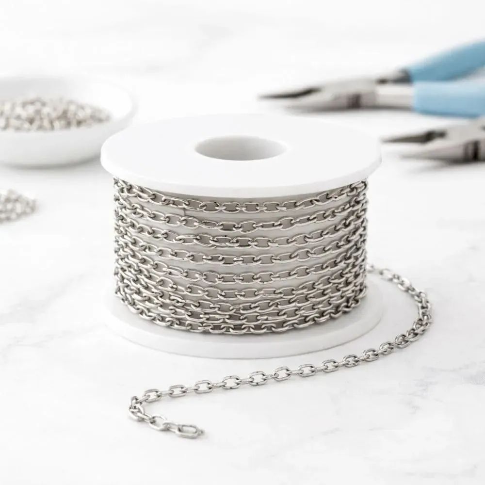 This stainless steel round paperclip chain features fine 2x1.5mm elongated links, offering a modern alternative to traditional cable chain. Its clean, contemporary look makes it ideal for minimalist jewellery designs. Sold as loose chain by the foot (30cm), it allows you to cut custom lengths for each project.