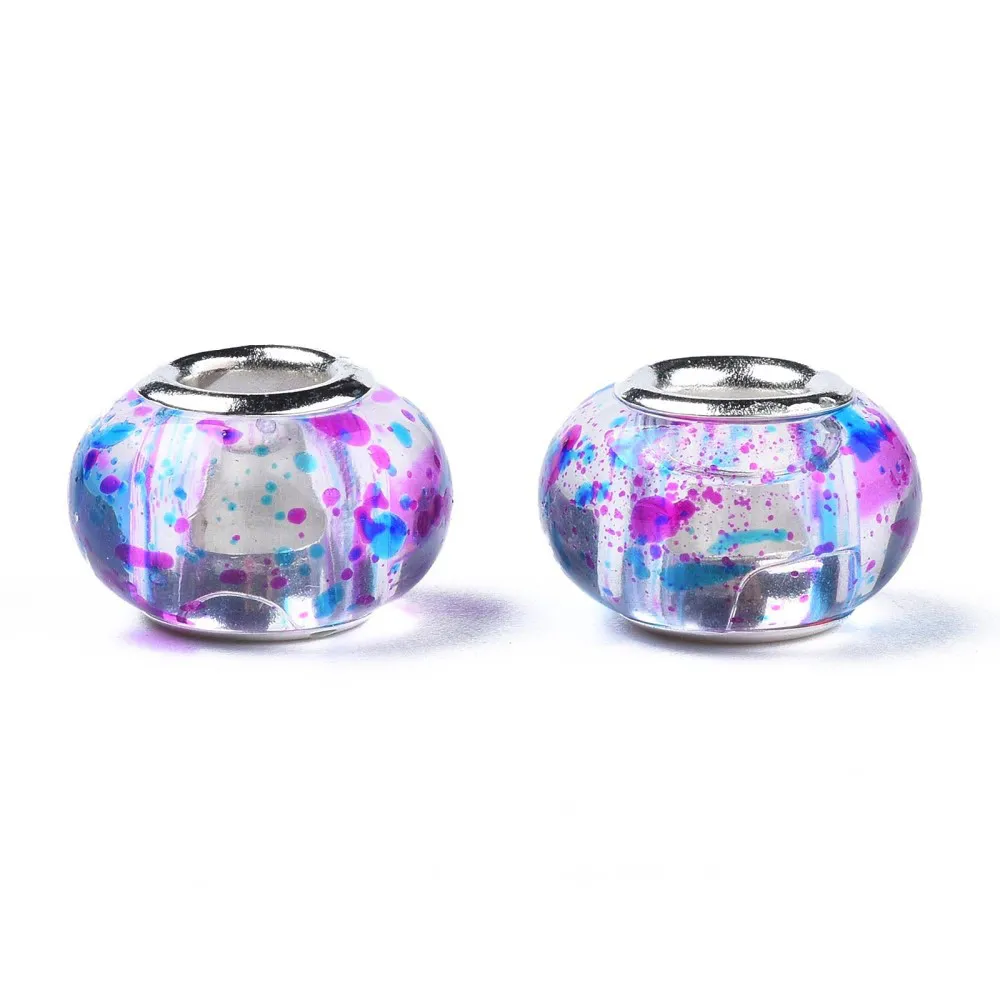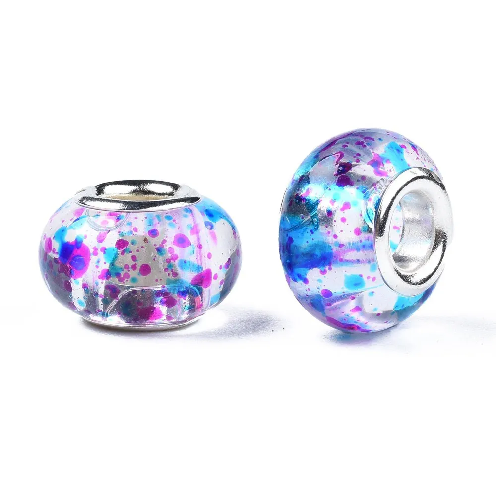 Add a burst of artistic colour to your designs with these Transparent Resin European Beads in Deep Sky Splash. Featuring vibrant splashes of deep sky blue, violet and fuchsia tones suspended in clear resin, these beads create a bold, modern look perfect for charm bracelets and statement jewellery.