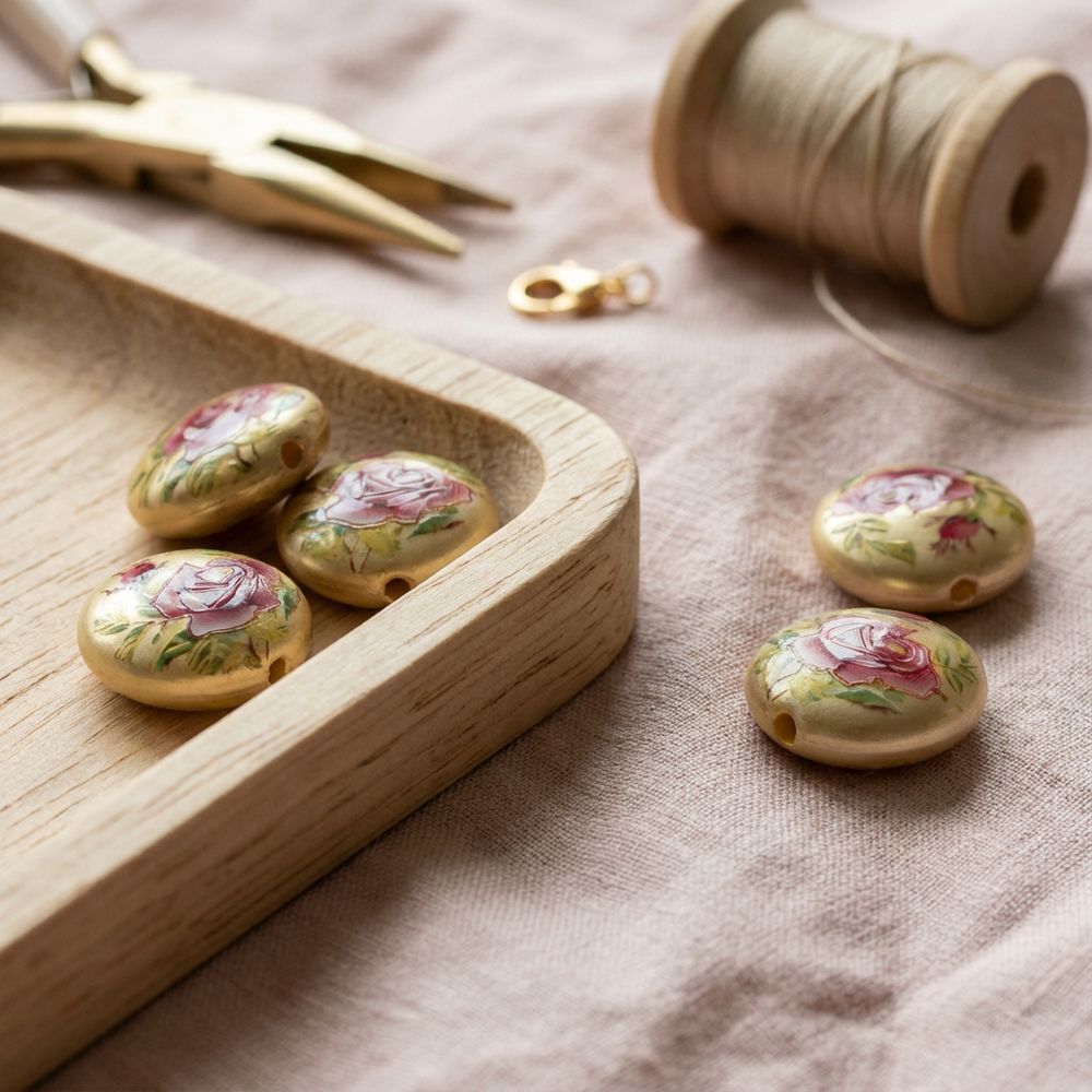 These Vintage Gold Rose Charm Puffed Coin Glass Beads feature rich gold-toned glass with a deep rose floral motif. Elegant and timeless, their puffed coin shape makes them perfect for vintage-inspired bracelets, earrings and necklaces.